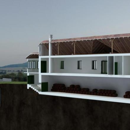 During the renovation of the villa, the architectural values of the former design were preserved; and the positioning and shaping of the new building was strongly influenced by the relation of the old house to the landscape. The press-house-like shape and dimensions of the simple, elegant buildings characteristic of the neighborhood appear on the aboveground sections of the new building. The large processing halls and rooms of the plant will be constructed belowground, according to the relief of the hillside. The existing cellar will continue to function as a barrel maturation room of the plant.